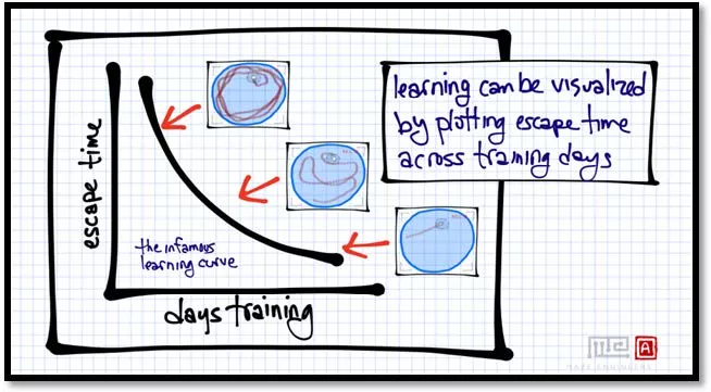 Figure: The learning curve in the Morris Water Maze. The time to find the platform (escape latency) decreases with training as swimming paths become less random and more directed.