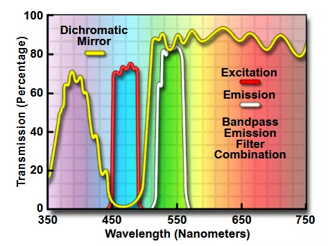 The optical transmission percentage of an example dichroic mirror (as well as a corresponding excitation and emission filters) is shown in Figure 2.