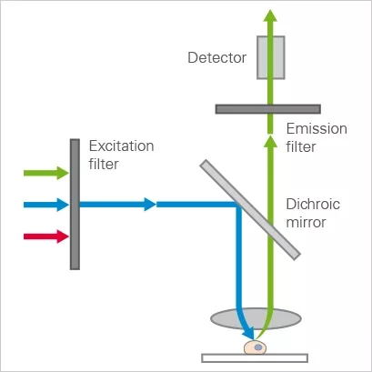 The optical components that are used to control and filter light in fluorescence microscopy are described in detail in the “Parts of the fluorescence microscope” section below.