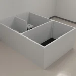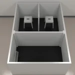 The piglet removable Y-maze measures 2.79 m in length, 1.86 m in width, and 0.96 m in height. It features a rectangular open space with a removable low wall divider, 0.84 m in length, which can be inserted on one side to create two choice compartments, each measuring 0.84 m by 0.9 m. Additionally, the maze includes a detachable isolation board that can be placed to separate the starting area from the choice compartments, providing an isolated section for the subjects.