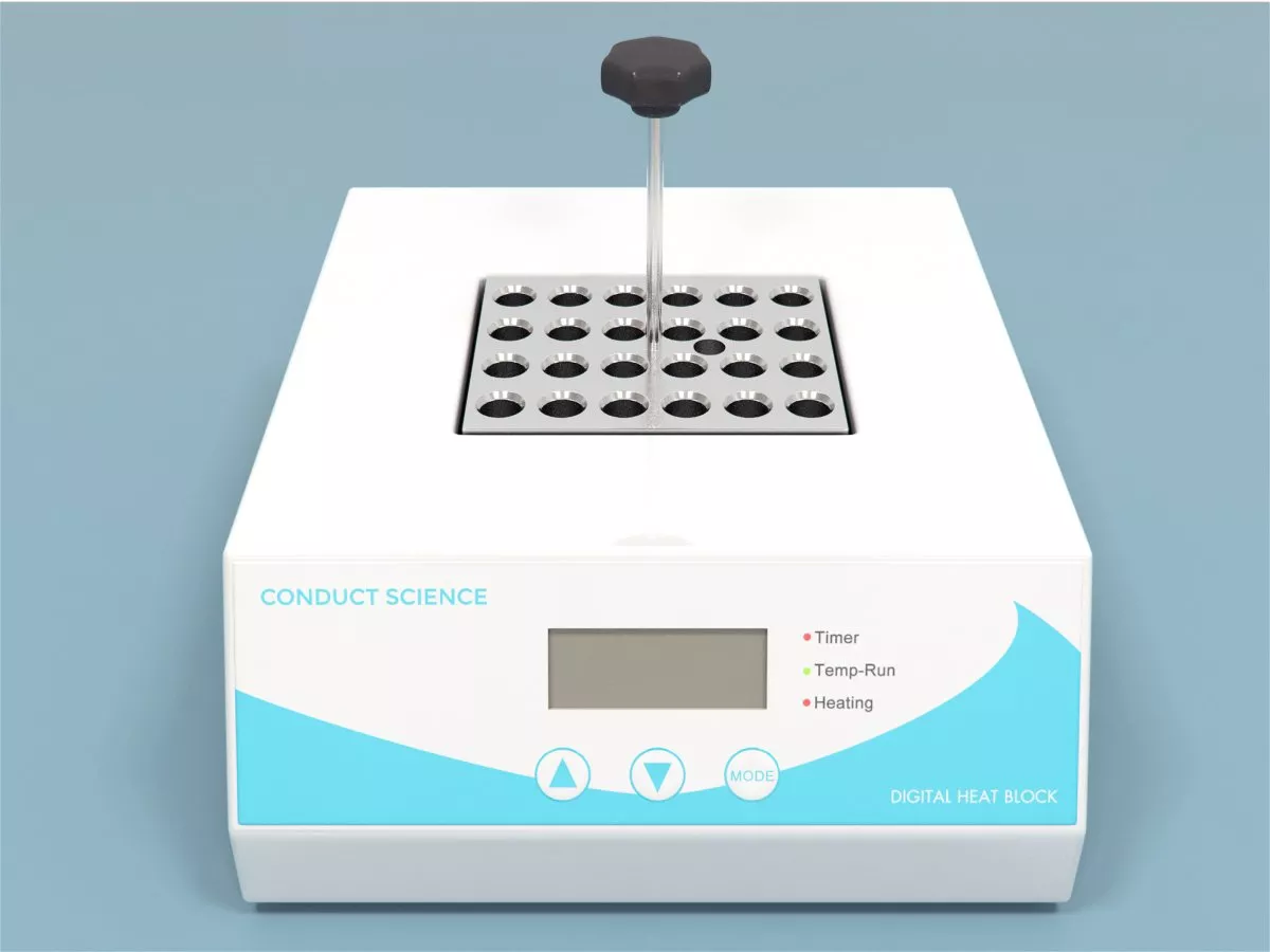 The heat block is connected to the heating control unit and contains several conical pockets of various sizes where users can place the samples in fitting containers and incubate them at the desired temperature.[1] Learn more about dry baths (strengths and limitations) here.