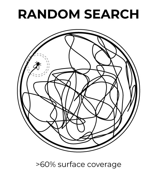 2. Random search: The fly appears to move without a defined strategy, wandering randomly without directing its movement toward any specific target.