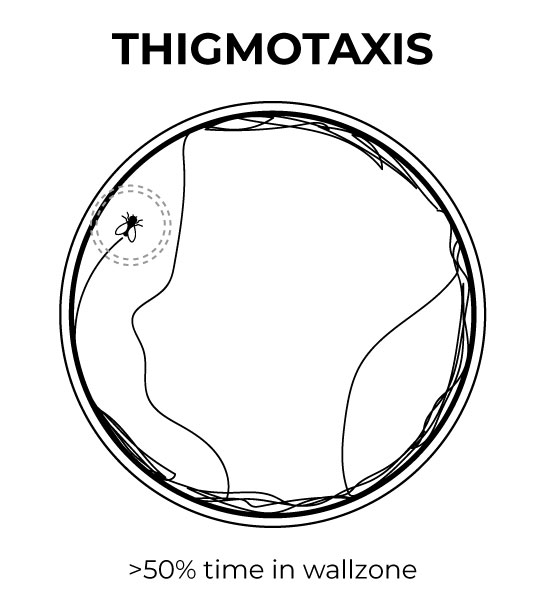 1. Thigmotaxis: The fly clings to the wall of the arena, a behavior that usually signals anxiety or uncertainty.
