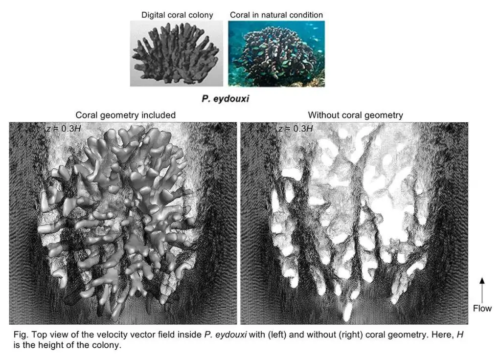 Obtaining the flow field inside the colony is not straightforward. Traditional measurement and visualization techniques were unable to depict the detailed flow profiles inside the colony due to the lack of acoustic and optical access at the interior due to the complex branching patterns of the coral colony. Earlier, researchers tried to use analytical methods to predict the flow condition inside the colony but these results differ significantly from the observed values. Numerical simulations can be an important tool to resolve the flow field inside the colony but capturing the complex geometry of real a coral colony is still a big challenge. In my research, I have used a special numerical technique (Immersed Boundary Method) to capture the hydrodynamic around Computed Tomography (CT) scan of a real coral skeleton. For CFD simulation, you need a high-quality mesh but generating body-conforming mesh around such complex geometry is difficult and expensive. Here, I have used the Cartesian grid instead of the body-conforming mesh to obtain the three-dimensional flow field and mass transport mechanism inside two different Pocillopora corals with different branching density.