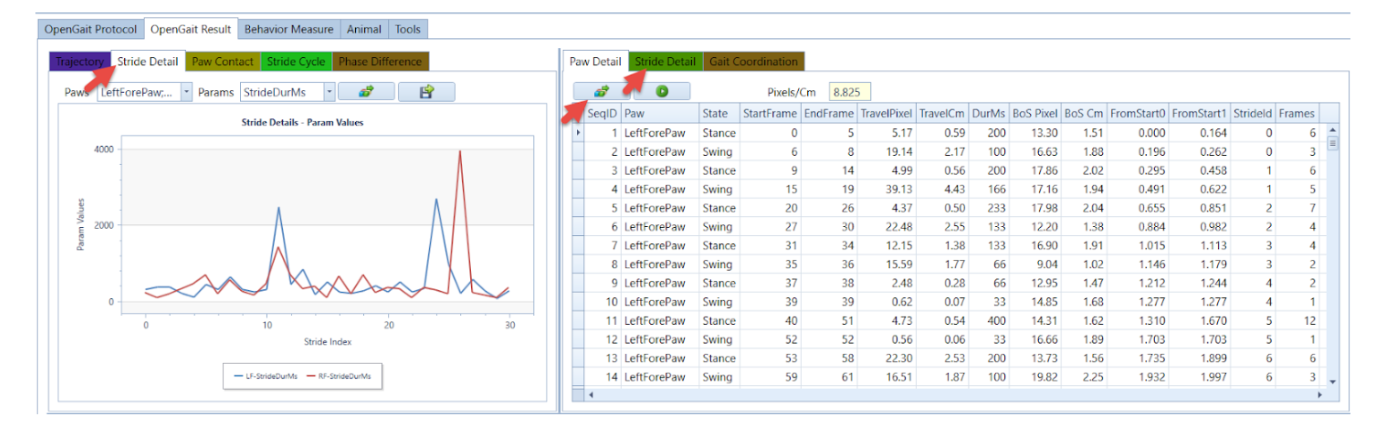 The Paw Details feature provides granular, phase-specific metrics for each individual paw, which is crucial for detailed gait phenotyping. For every stance (paw on ground) and swing (paw in air) phase, the software calculates three key metrics: Duration, Distance Traveled, and Base of Support (BoS)..