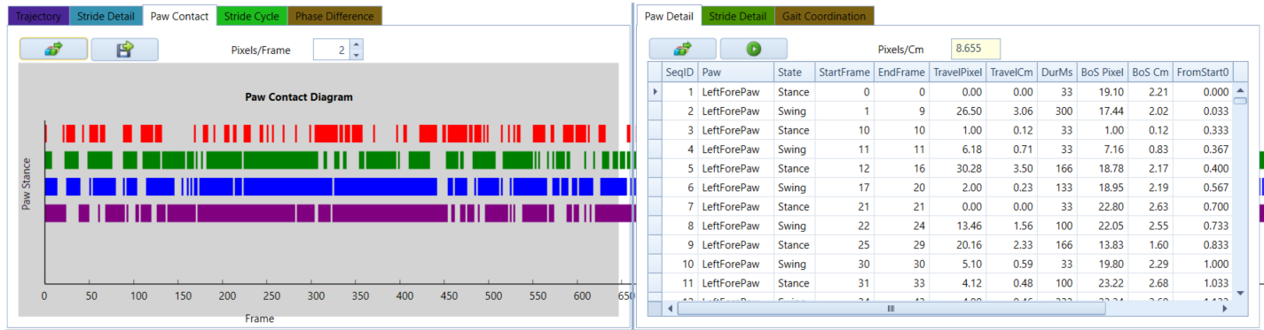 The Paw Contact Chart displays paw’s stance vs swing duration in frames. X-axis represents the frame.